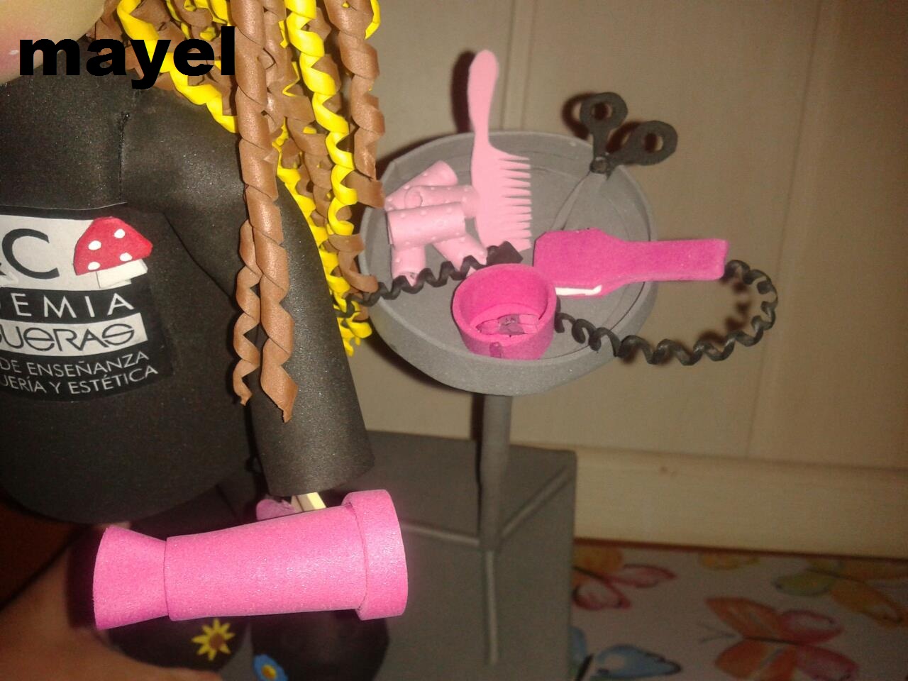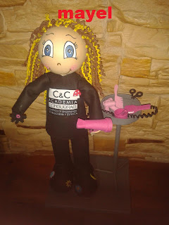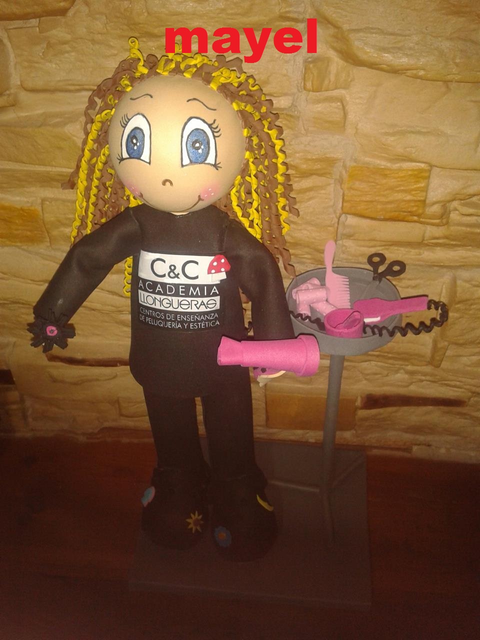 Hoy os enseño un encargo muy especial que nos hicieron. Es nuestra peluquera y profesora de la academia c&c llongueras de león. No le falta detalle, su uniforme, sus zuecos personalizados iguales que los de ella, su piercing en la nariz, sus mechas en el pelo, y todos los accesorios peine, secador,los rulos, las tijeras, las planchas y la paleta del tinte.