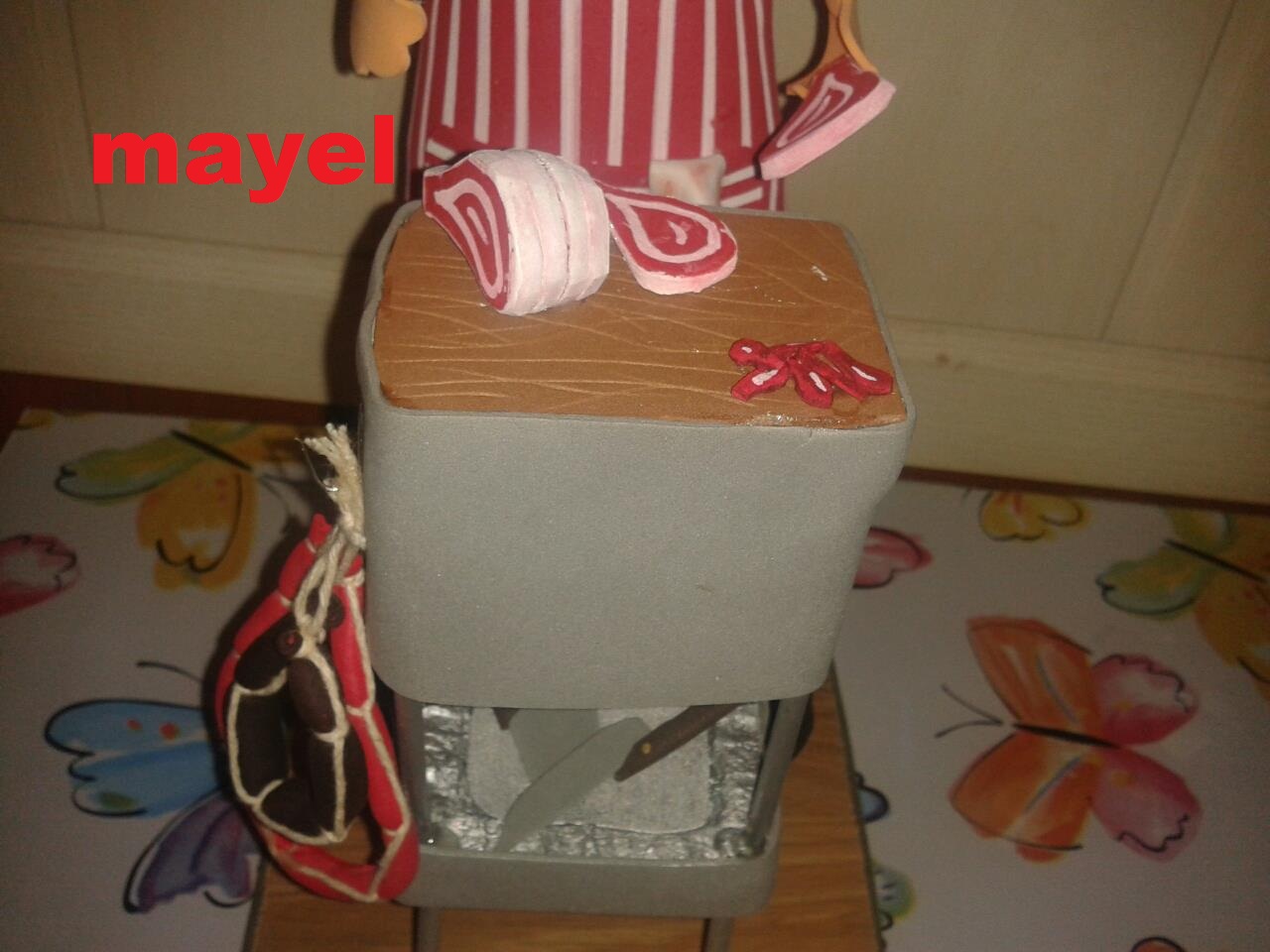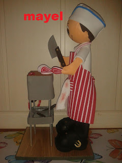 Fofucho carnicero. lo hemos hecho con todo detalle, su gorro, su delantal, su machete, cortando unos buenos chuletones y los chorizos y las morcillas del otro lado.