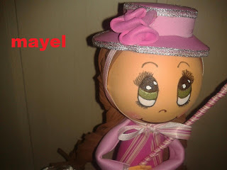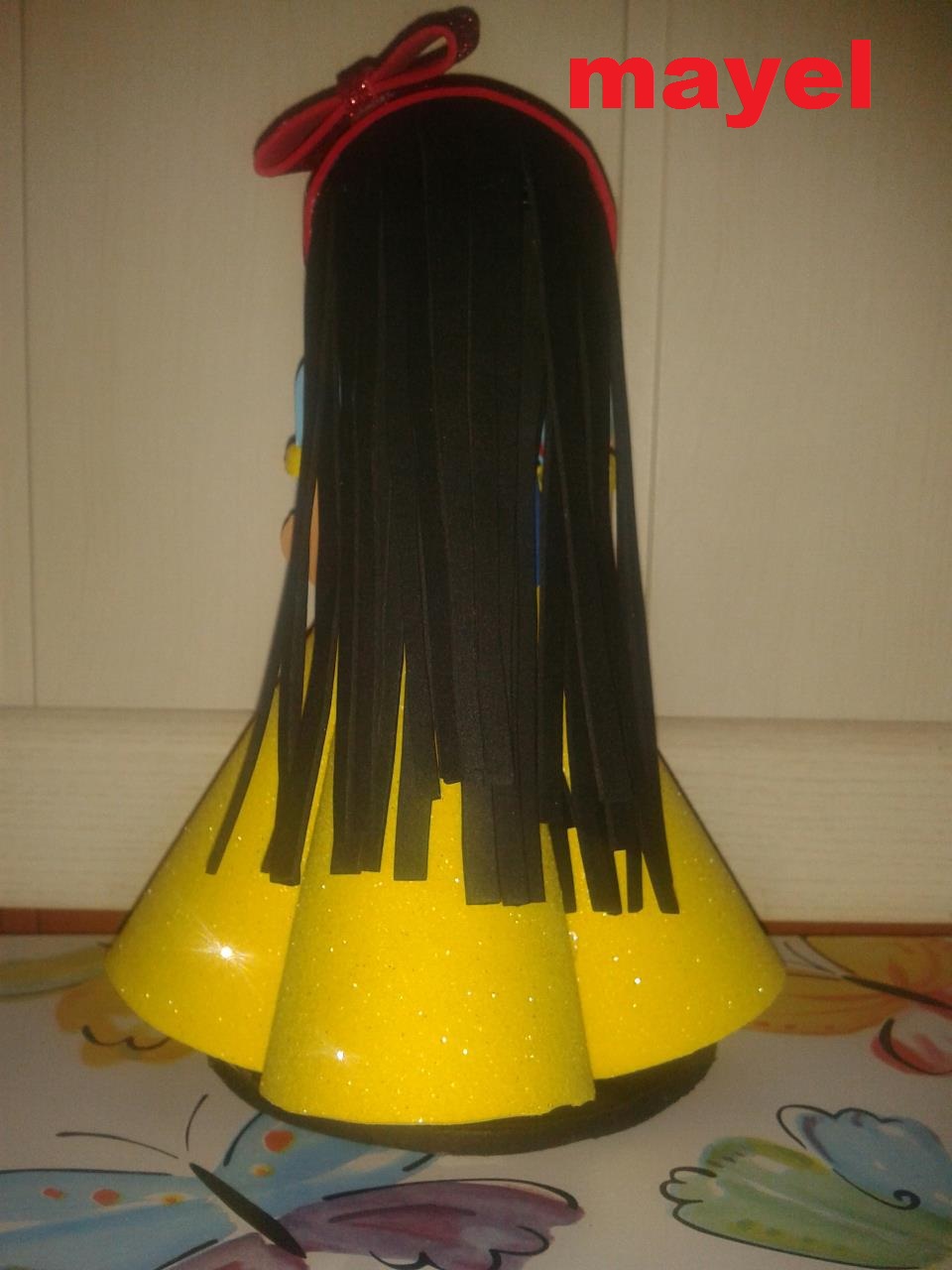 sombrero, su sombrilla, sus trencitas y la base la hemos adornado con unas pequeñas flores, realizadas en goma eva tambien.